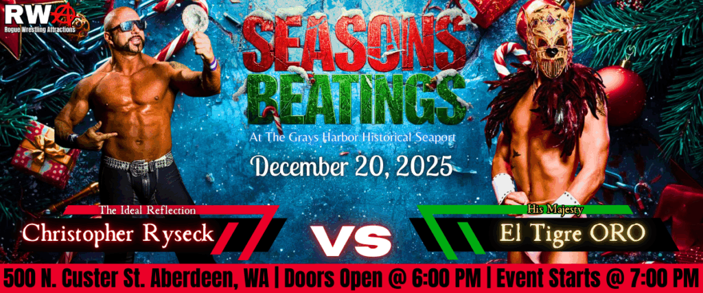 6.) Attend Seasons Beatings: On December 20, 2025, join Rogue Wrestling Attractions at the Grays Harbor Historical Seaport Event Center in Aberdeen for an exciting night of live professional wrestling. Present your tickets at the entrance for entry.