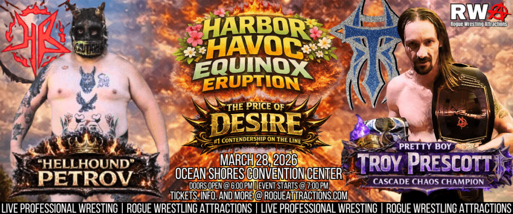 6.) Attend Harbor Havoc – Equinox Eruption: On March 28, 2026, join Rogue Wrestling Attractions at The Ocean Shores Convention Center in Ocean Shores, WA, for an exciting night of live professional wrestling. Present your tickets at the entrance for entry.