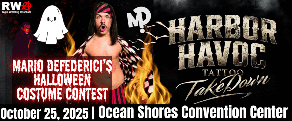 At Harbor Havoc – Tattoo Takedown, the unpredictable gets even wilder! Mario Defederici isn’t just stepping into the ring; he’s stepping up to host the first-ever RWA Halloween Costume Contest. Fans, this is your chance to shine under the bright lights of RWA. Come dressed in your best, most creative, or downright terrifying costume for the opportunity to make your mark in front of a live crowd.