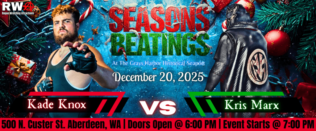 6.) Attend Seasons Beatings: On December 20, 2025, join Rogue Wrestling Attractions at the Grays Harbor Historical Seaport Event Center in Aberdeen for an exciting night of live professional wrestling. Present your tickets at the entrance for entry.